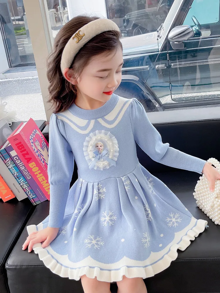 Disney Girls' Knitted Skirt Cute Ruffle Bow Princess Elsa Dress O-neck Long Sleeved Woolen Dress Autumn New Children's Dresses
