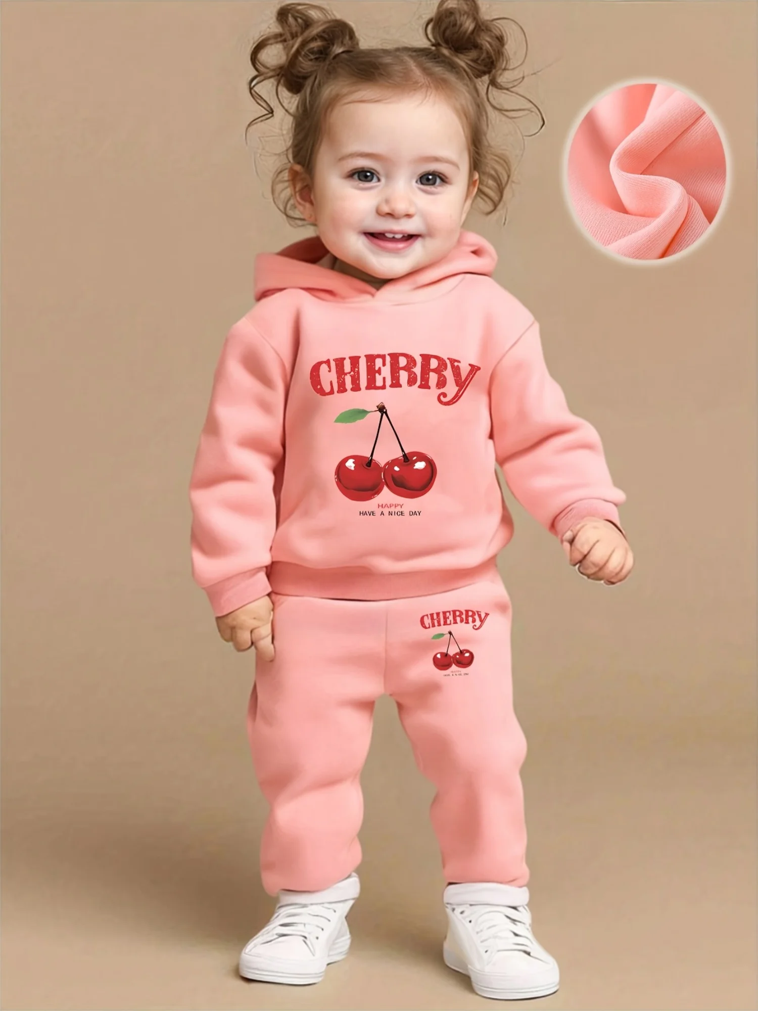 A two-piece set of cute cherry English printed fleece hoodie and pants for newborn girls in autumn and winter