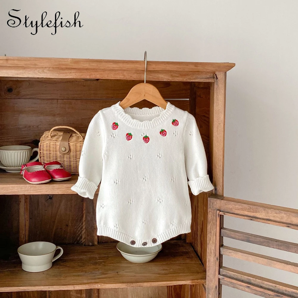Autumn 0-3 year old baby clothing, baby girls' sweaters, strawberry embroidered long sleeved knitted triangle climbing clothES