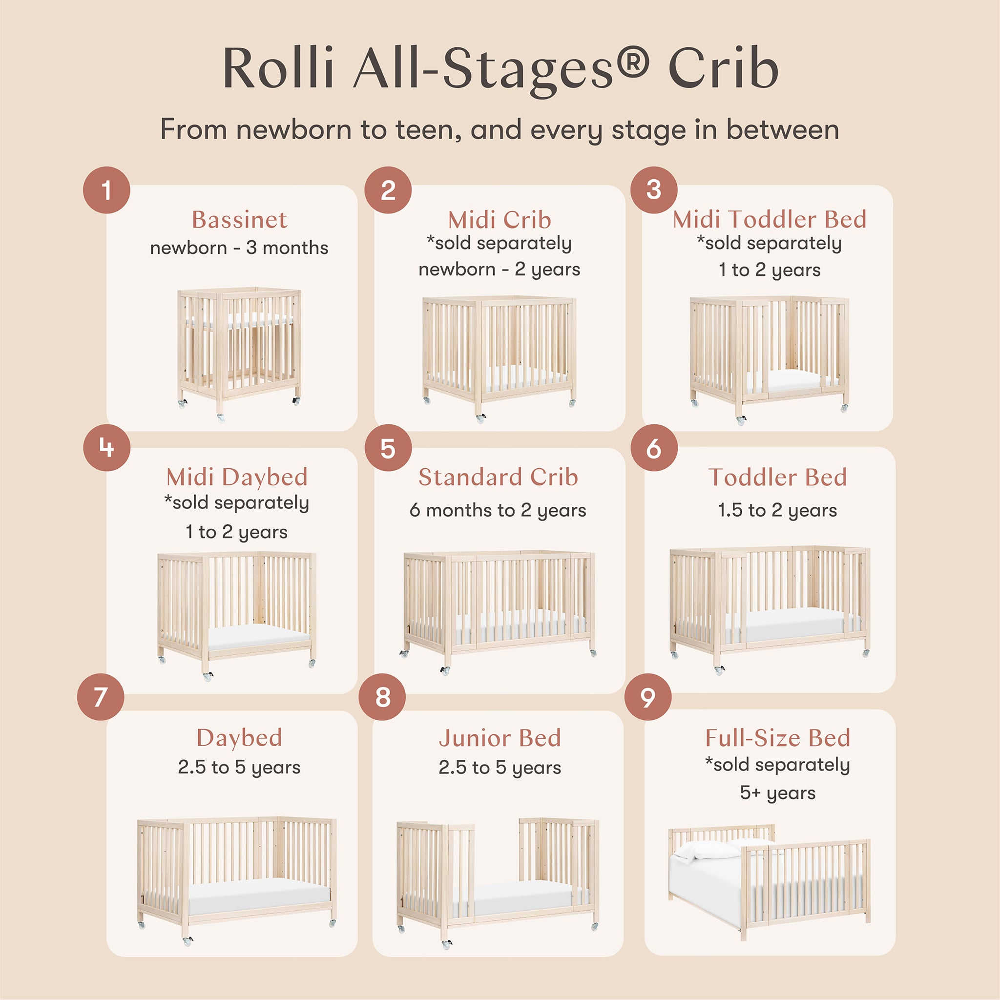 The versatile Rolli All-Stages 9-in-1 Converible Crib acts as your official All-Stages starter kit and includes the essential conversion stages to support your babe from day 1 to year 5. Choose from 5 included conversions across 2 unique sizes to...