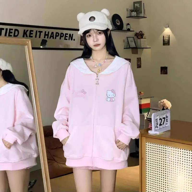 Anime Kawaii Hello Kitty Girls Zipper Sweatshirt Spring Autumn Cotton Cute Navy Collar Cardigan Coat Student Loose Tops Gift
