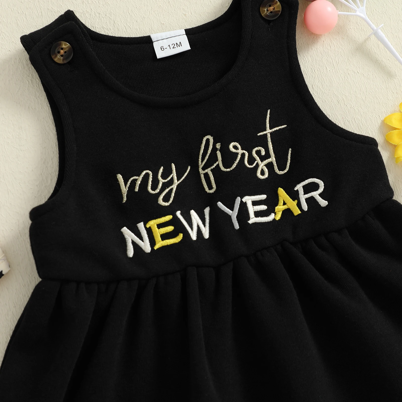 Baby Girls 2 Piece Outfit My First New Year Print Long Sleeve O Neck Jumpsuit Letter Embroidery Sleeveless Dress Set
