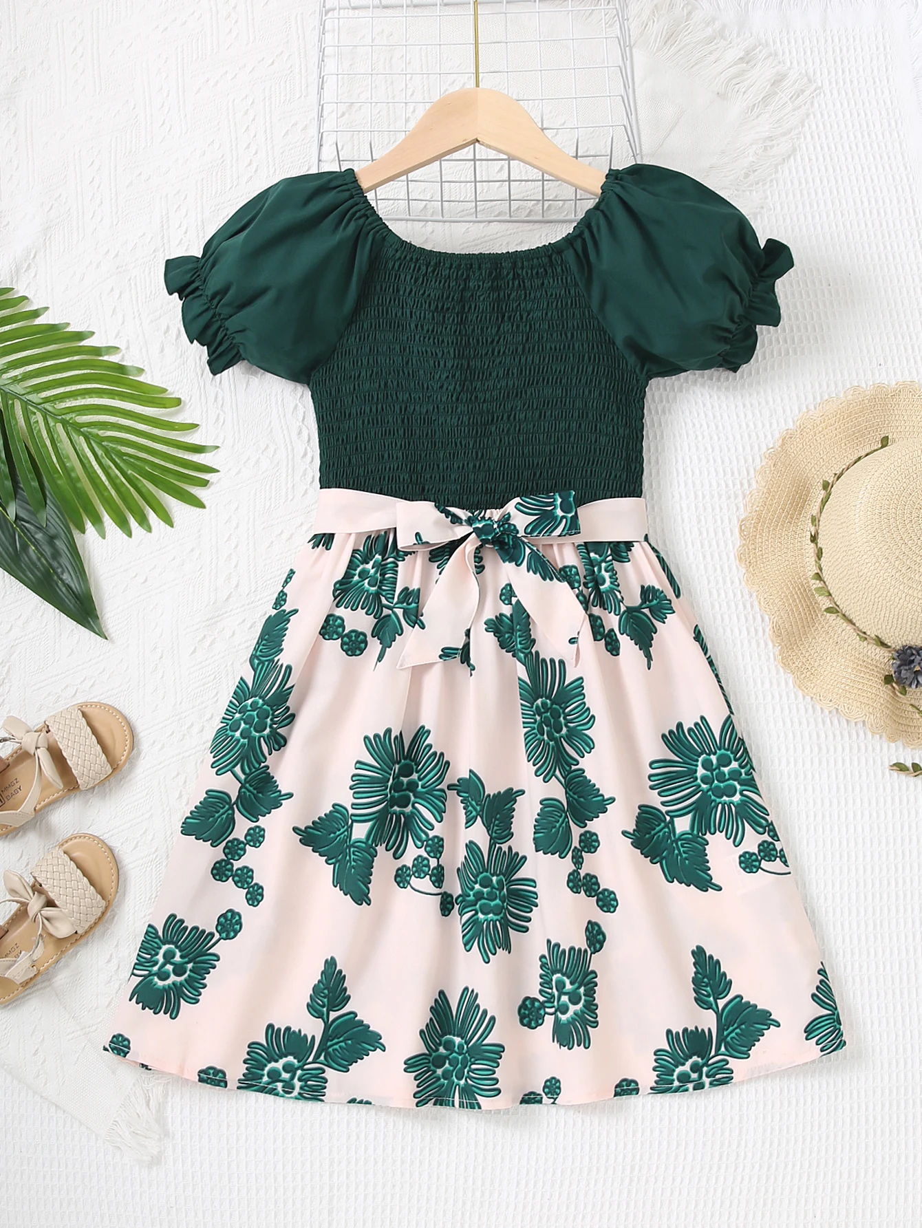 Girls' Summer Cute Woven Hug Micro Elastic Printed Princess Dress Girls' Short Sleeves Fashionable Splicing Skirt  Read more