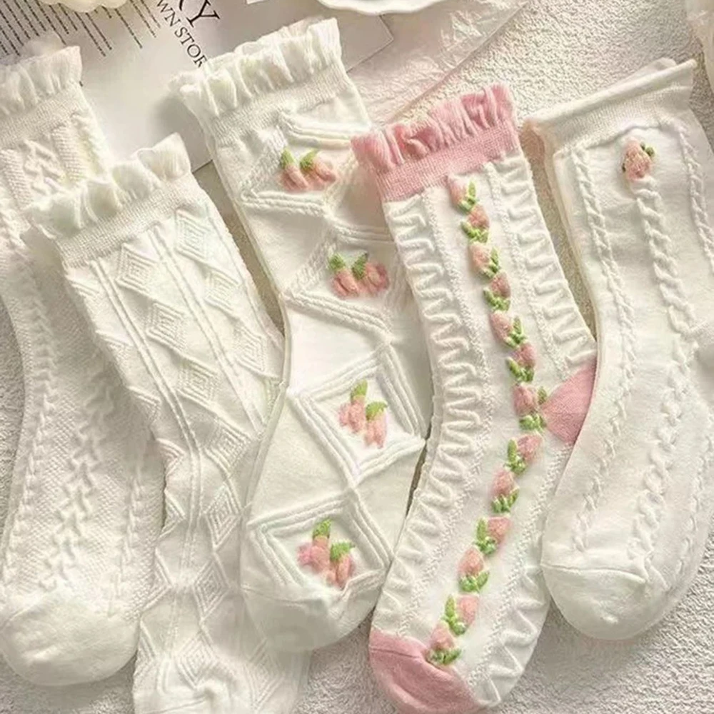 5 Pairs Cute Lace Mid Leg Socks Ruffled Edges Harajuku Style Soft Fashionable Suitable Girls Comfortable Sweat Absorbing Socks