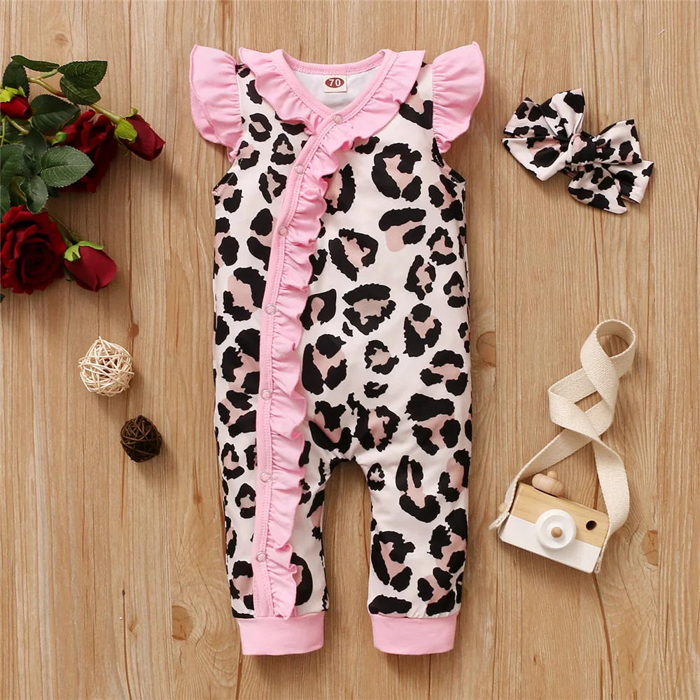 0-12 Months Newborn Baby Girl Bodysuit Fly Sleeves Romper + Headband Toddler Girl Summer Fashion Leopard Pattern Jumpsuit