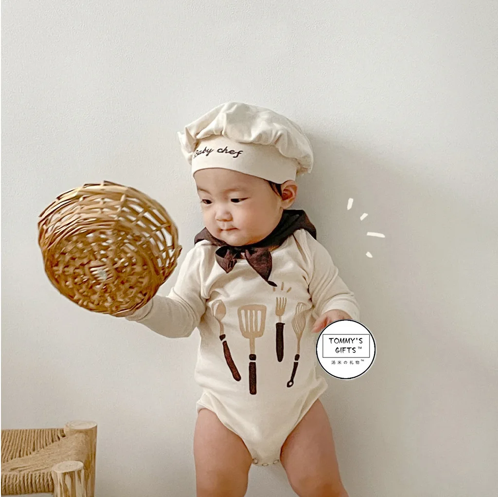 Baby Chef Costume Cotton Bodysuit with Hat Long Sleeve Infant Romper for Newborn Photoshoot & Cozy Warm Daily Wear 66-90 Cotton