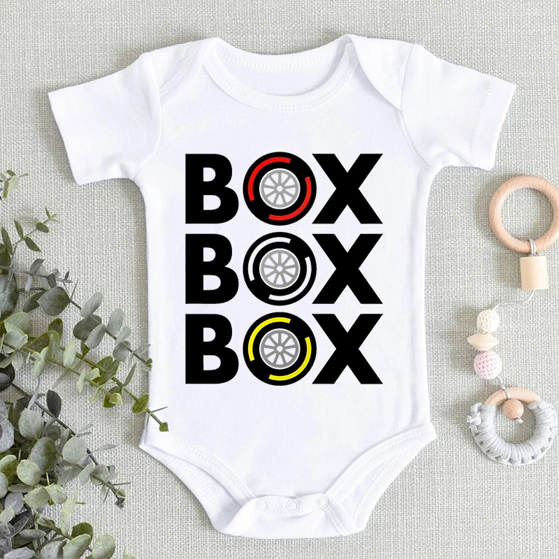"Box Box Box" F1 Tyre Compound Design Newborn Bodysuit Short Sleeve Jumpsuit Boy Girl Baby Clothes Soft Cotton Infant Romper