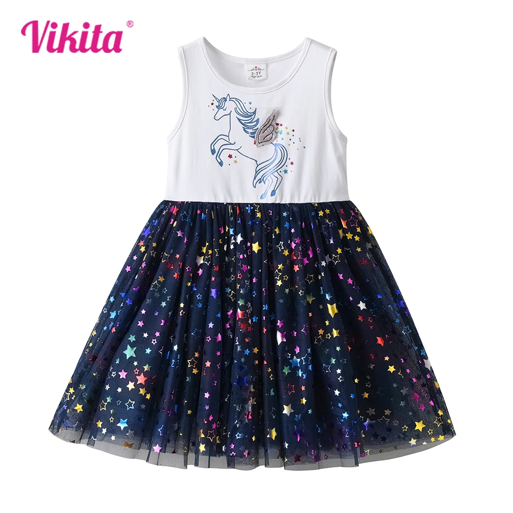 VIKITA Girls Summer Sleeveless Patchwork Dress Kids Licorne Print Cartoon Dress Toddlers Star Sequins Appliqued Colorful Dresses