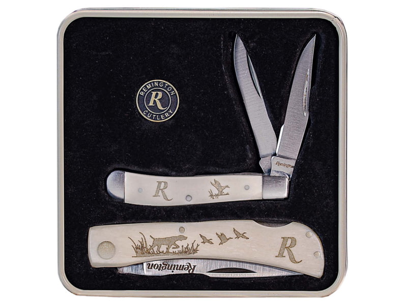 Remington Tin Collector 2-Knife Gift Set Folding Knife Mallard Duck Set 2.75in Peanut 3 1/2in Lockback 8Cr13Mov Stainless Steel V-Flat Blades White