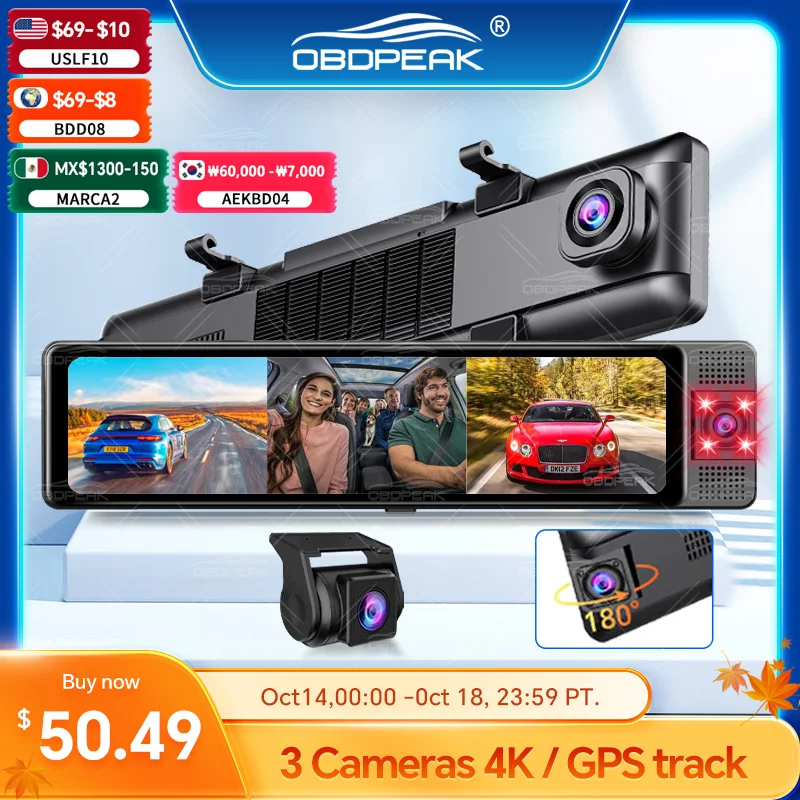 OBDPEAK 3 Camera Dash Cam 4K Car DVR Front Inside Rear 1080P GPS Tracking Night Vision Video Registrator Dashcam Parking Monitor