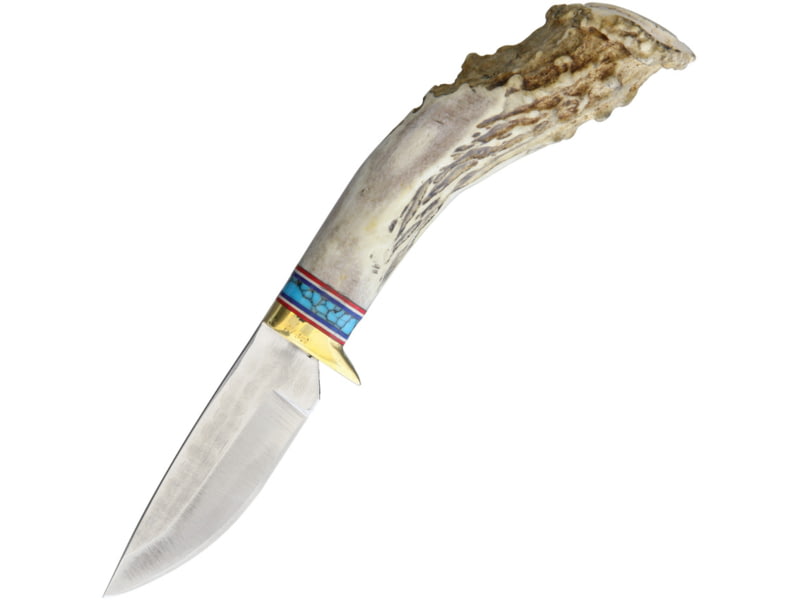 Ken Richardson Knives Small Drop Point Hunter Knife 3" 1085HC steel blade Shed deer or elk antler handle with turquoise inla KR1403TDP