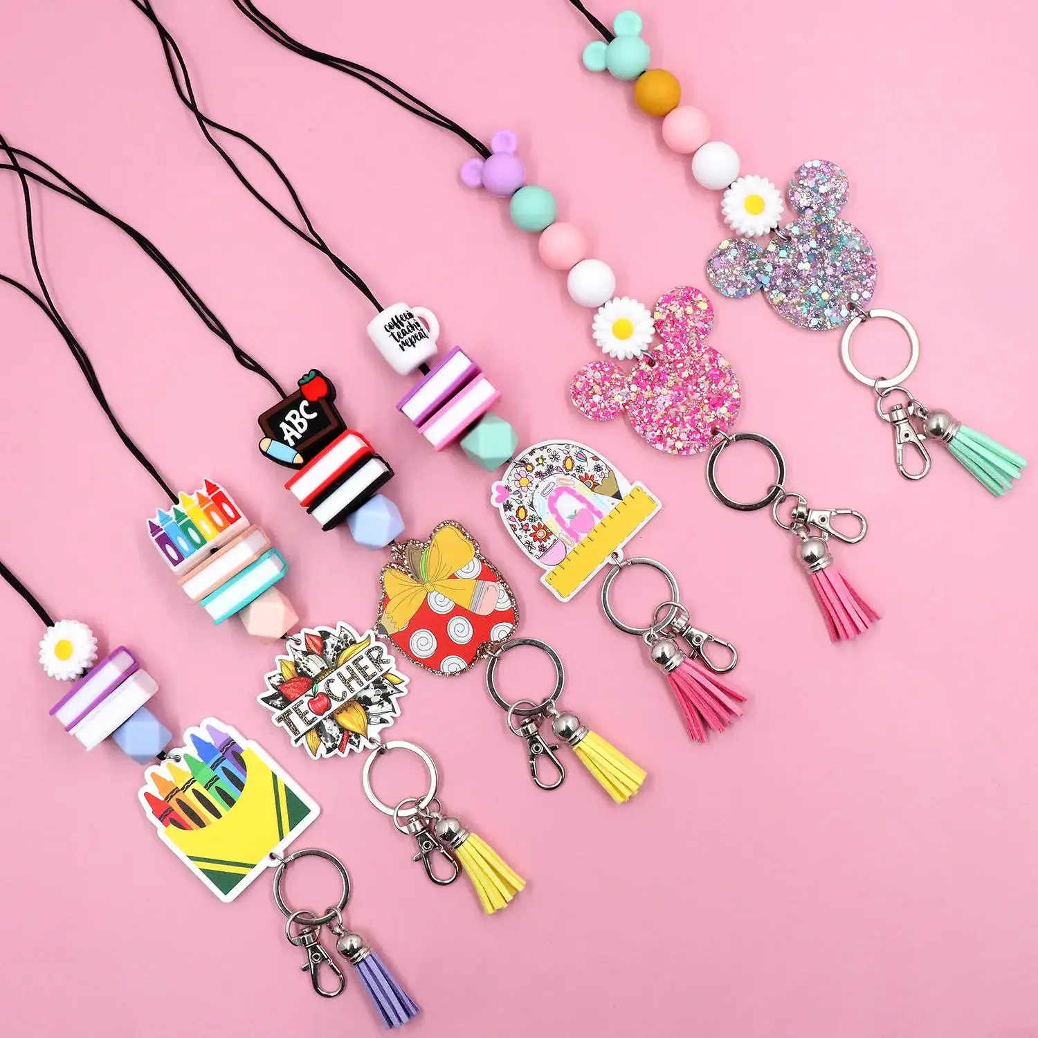 Silicon Beaded Lanyard Keychian With Mouse Head Book Rainbow Sunflower TeacherGifts Tassel Acrylic Glitter