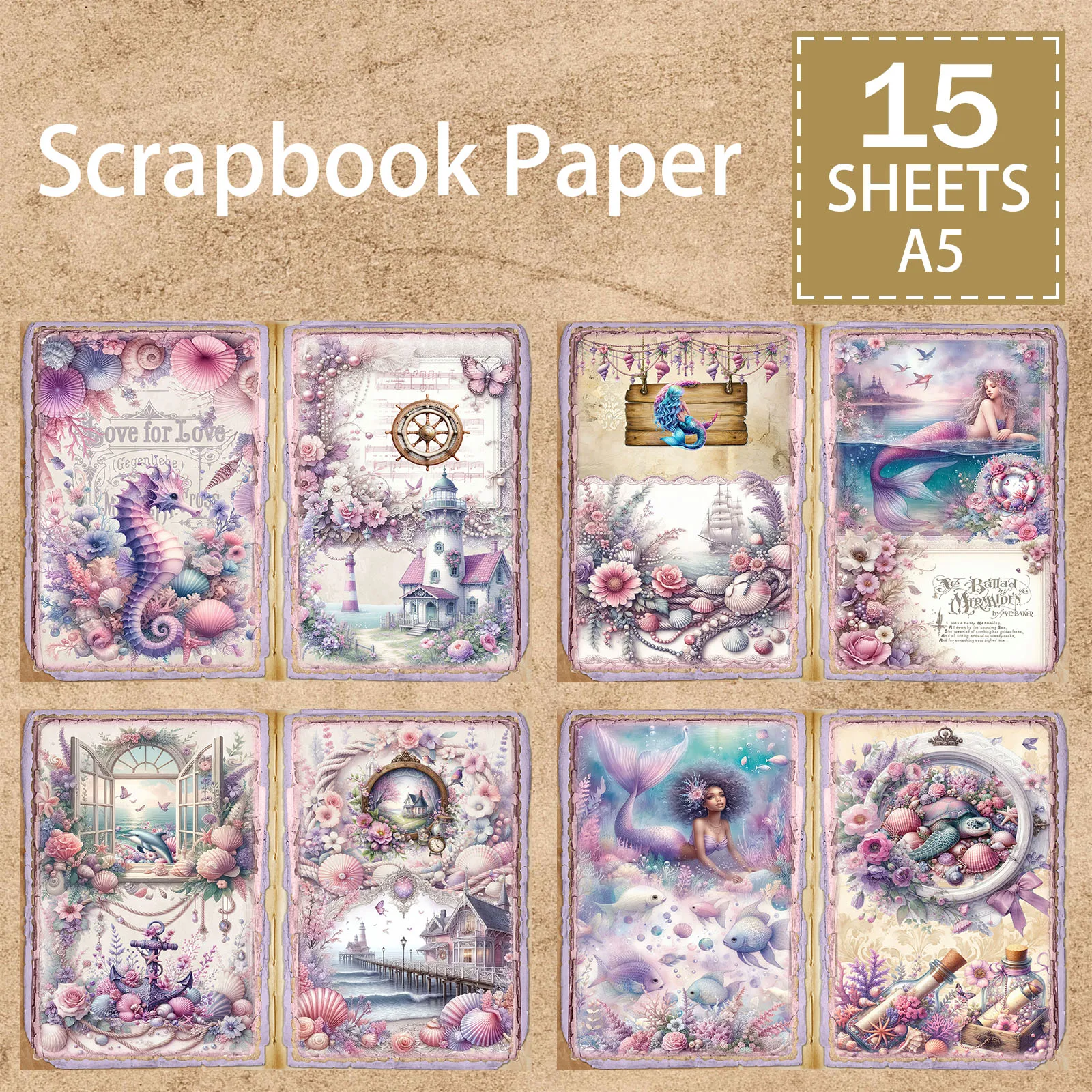15 Sheets A5 Size Fairytale Undersea World Creatures Cute Mermaid Purple Background Vintage Grunge Journal Planning Scrapbooking