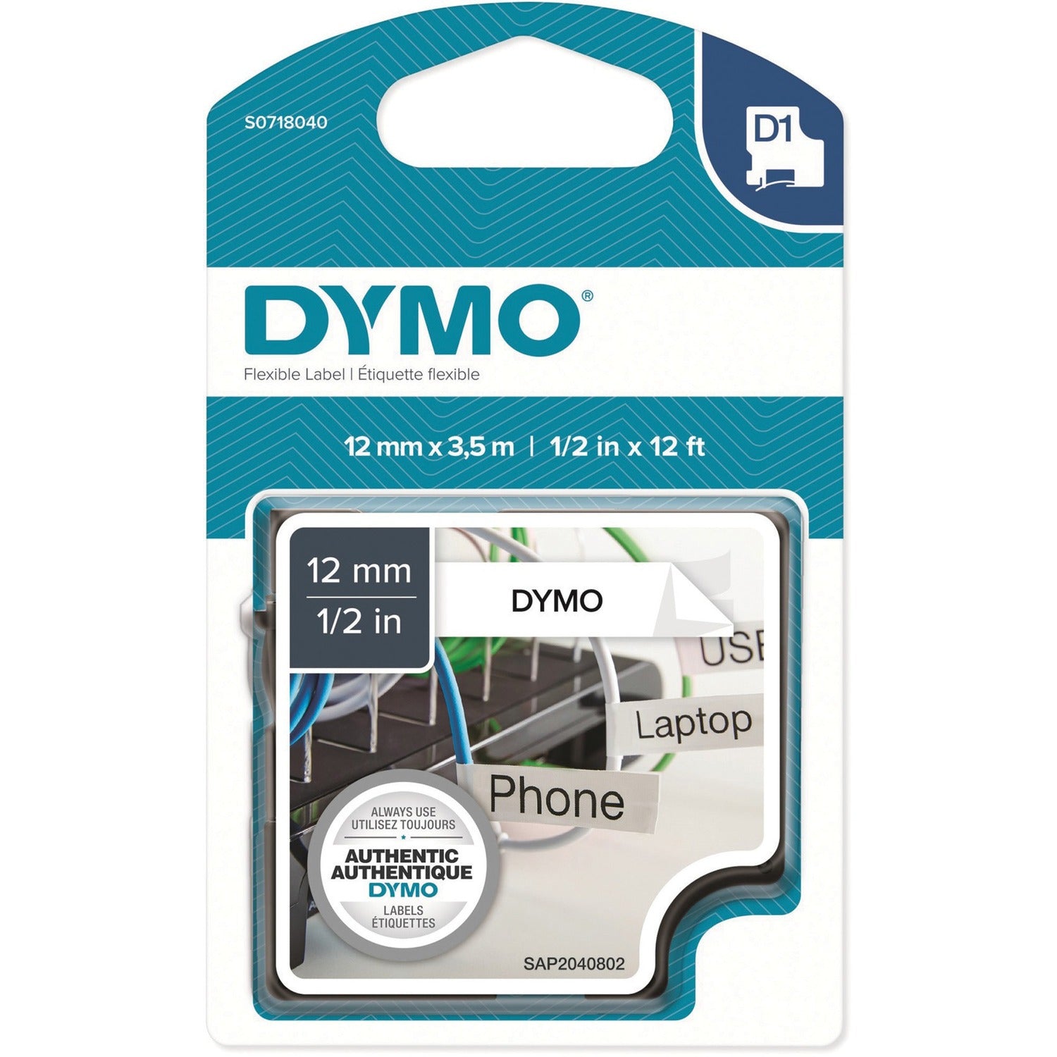 Dymo S0718040 D1 Flexible Nylontape 12mm, 15/32" Width, Permanent Adhesive, Arched Rectangle, Black, White, Nylon, Self-adhesive, Flexible DYMS0718040