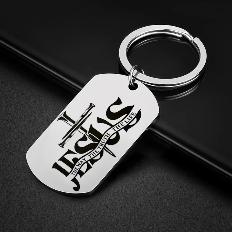 Jesus Crucifix Cross Dog Tag Keychains Stainess Steel Christian Bible Verse Key Chain Jewelry