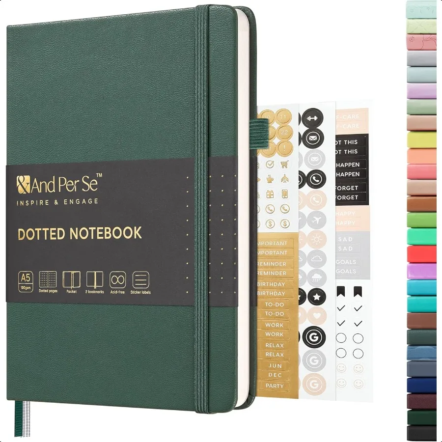 Dotted Journal Notebook A5 Hardcover Leather Journal 160 Pages 100 gsm Thick Dotted Paper3 Sheets of Stickers Included 5.7'' x