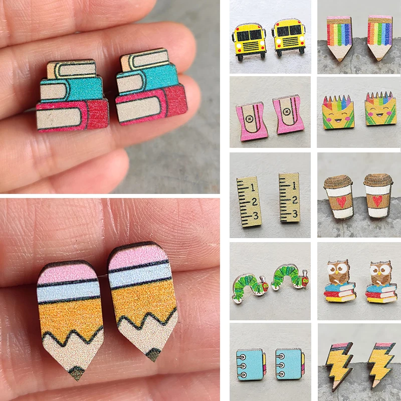 Cute Wooden Pencil Student Earrings Lightning Ruler Blackboard Parrot Book Teaching Supplies Teacher Earrings Fashion Jewelry  Read more