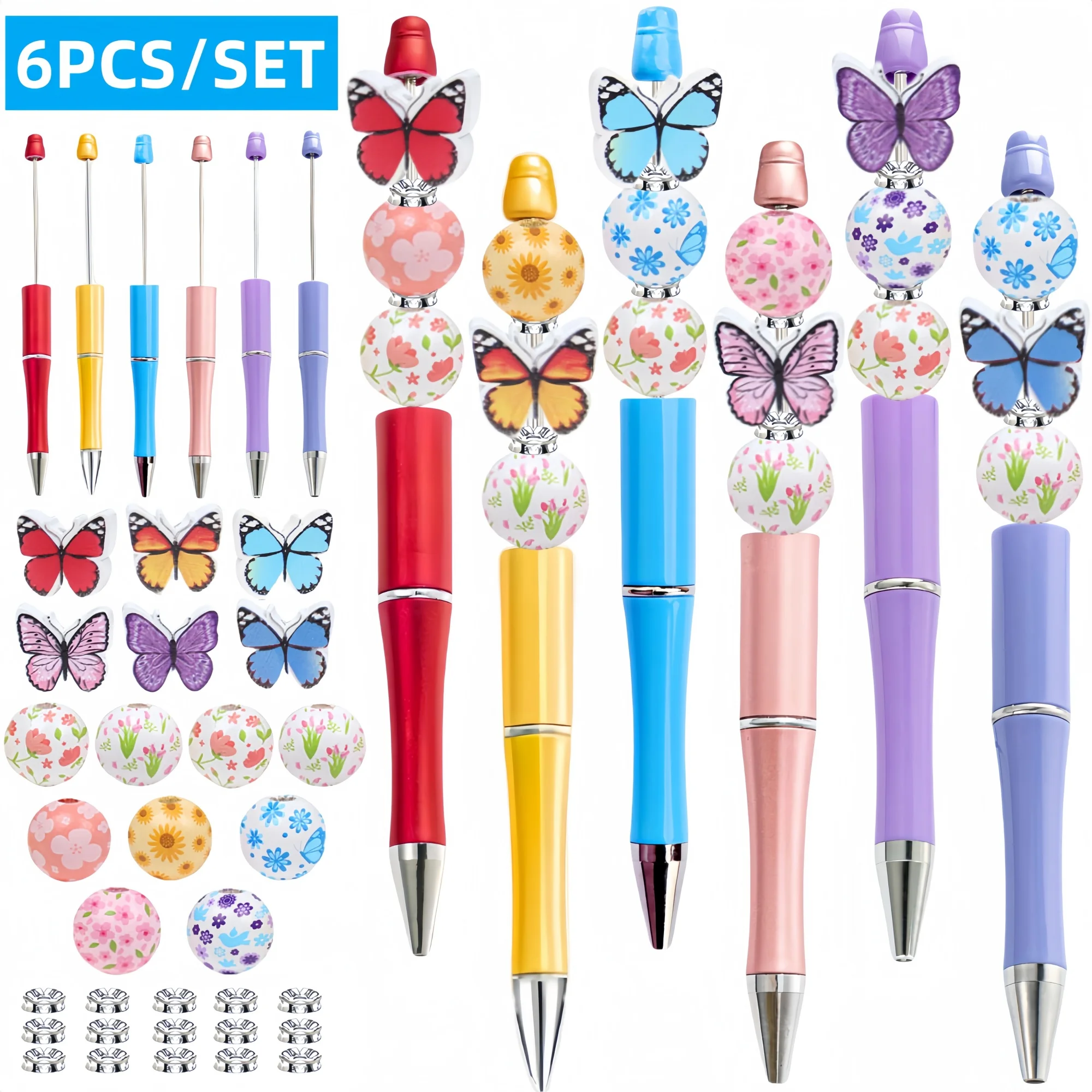 6PCS New Spring And Summer Rainbow Butterfly Flower Theme DIY Bead Ballpoint Pen&Wooden Bead Set,Office&Study Supply