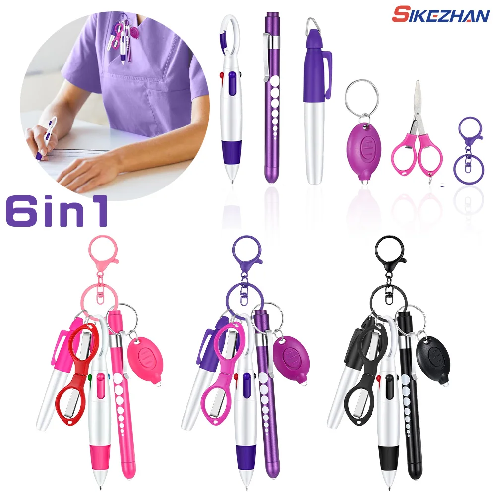 6in1 Multifunction Retractable Ball Pen Set Flashlight Foldable Scissors Ballpoint Pen Keychain Nurse Pens Permanent Marker