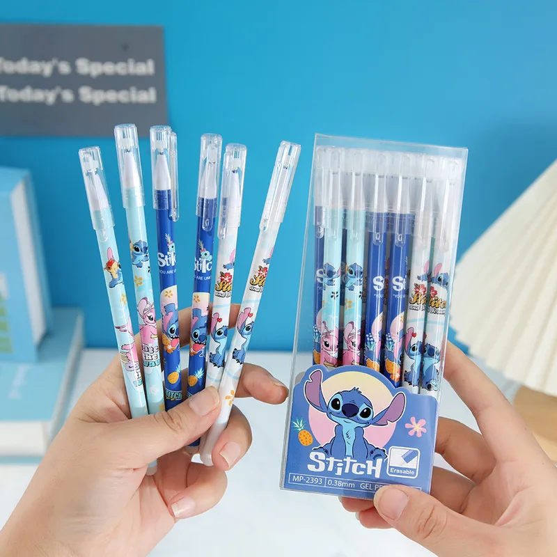 Disney 12Pcs Erasable Gel Pen Cartoon Set Stitch Cute Styling Cap 0.38Mm Blue Straight Pen Students Start Learning Stationery