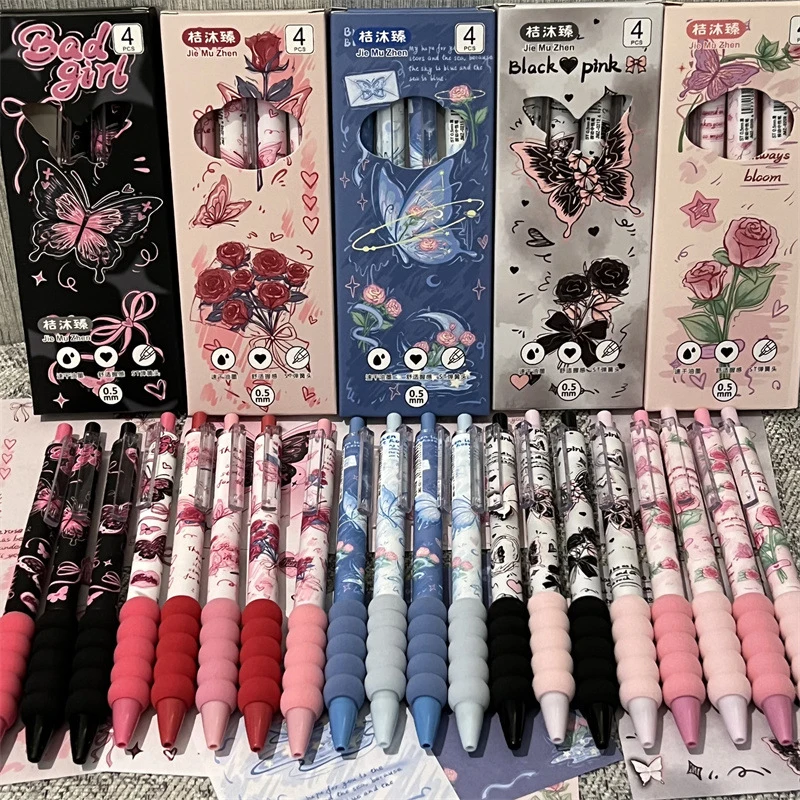 4Pcs Kawaii Butterfly Gel Pen Black Ink ST Nib Writing Smooth Soft Grip Sponge Pen School Office Stationery Supplies