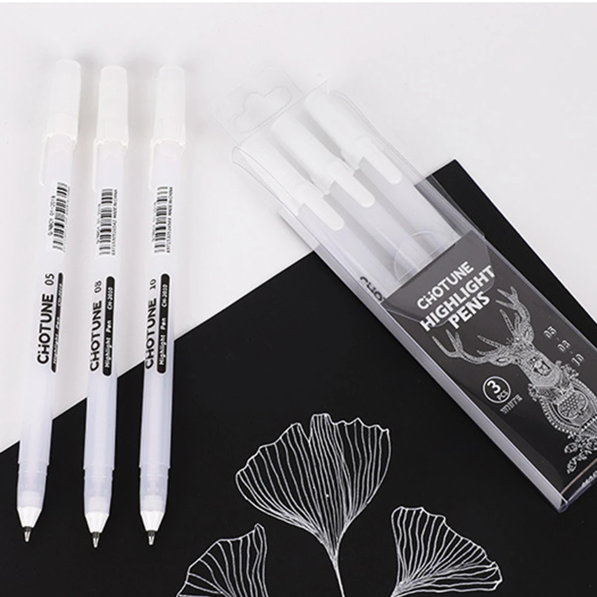 3 Pieces/Set Creative White Ink Gel Pen 0.6mm Highlight Marker Pen for Student Stationery Drawing Art Writing School Supplies