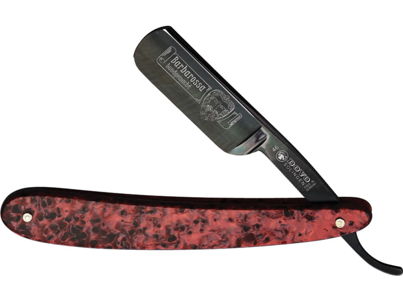 Dovo Barbarossa 5/8 Straight Razor DOV12582336. Black and red acrylic handle. Extended tang. Round point round spine. Full hollow ground. 0.63" width. Boxed. Specifications for Dovo Barbarossa 5/8 Straight Razor DOV12582336: Manufacturer: Dovo...  Read more