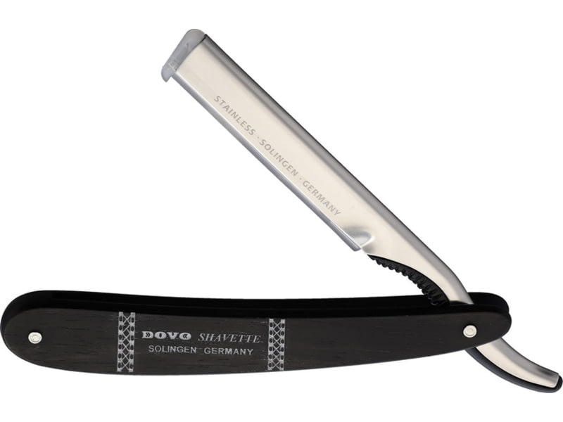 Dovo Shavette Ebony Handle. 63" (14.3cm) closed. Ebony wood handle. Extended tang. Mirror finish stainless blade holder. Boxed. Specifications for Dovo Shavette Ebony Handle: Manufacturer: Dovo Blade Material: Stainless Steel Closed Length: 5.63 in...  Read more