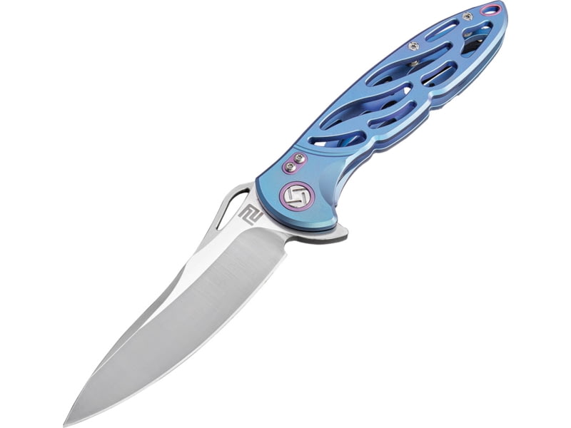 Artisan Cutlery Hoverwing Framelock Folding Knife 5in Closed 3.75in Satin S35Vn SS Blade Blue Titanium Handle Thumb Pull Pocket Clip Black Nylon. 3.75" stonewash finish D2 tool steel blade. Stonewash finish 2Cr13 stainless handle. Extended tang....  Read more