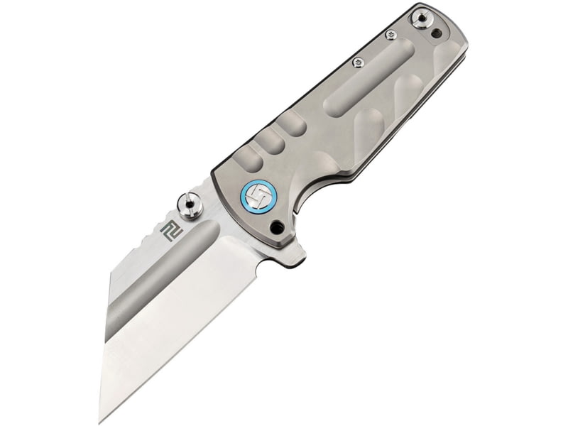 Artisan Cutlery Tomahawk Framelock Folding Knife 4in Closed 3in Satin Bohler M390 SS Blade Gray Titanium Handle Pocket Clip Metal Tin Black Nylon