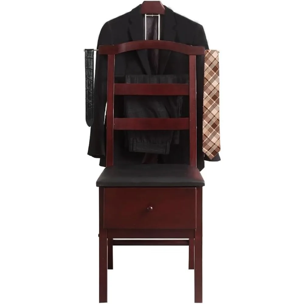 Wooden Suit Valet Stand With Contour Hanger Chair Valet With Drawer Trouser Bar And Tie & Belt Bar Freestanding Clothes Valet St