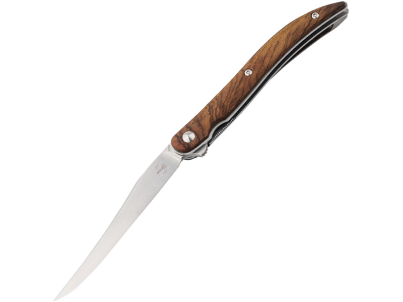 Boker Plus Texas Toothpick Linerlock BOP01BO389 3.25 in Folding Knife 01BO389. 25" (10.8cm) closed. 3.25" (8.26cm) satin finish VG-10 stainless blade. Cocobolo wood handle. Extended tang. Pocket clip. Black nylon zippered storage case. Boxed. No...  Read more