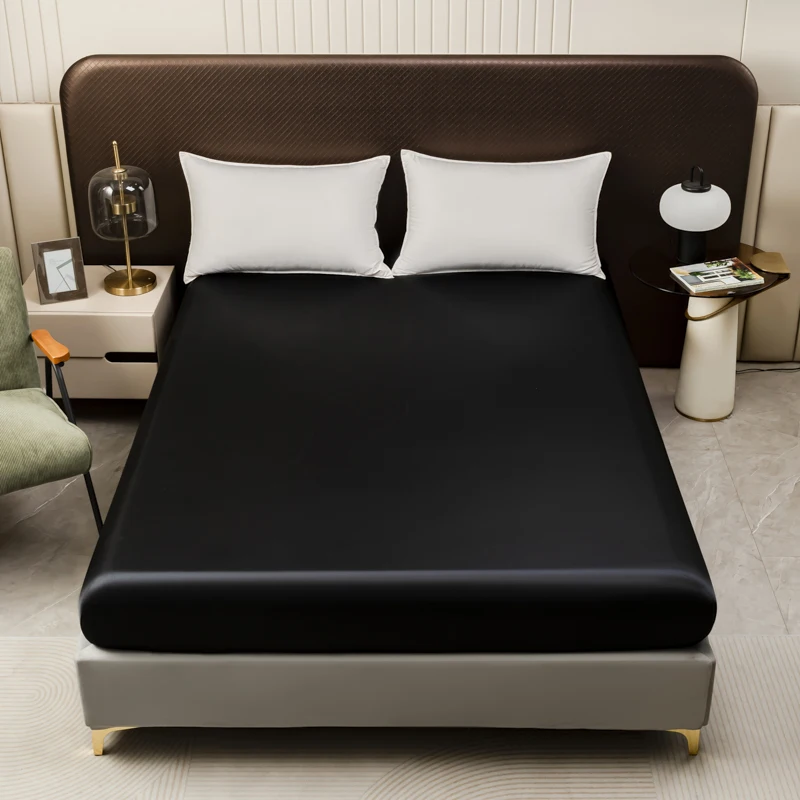 1PC Black Fitted Bed Sheet for Double Beds Satin Silky Bed Cover for Summer Single/Queen/King Ice Cooling Bed Fitted Sheets