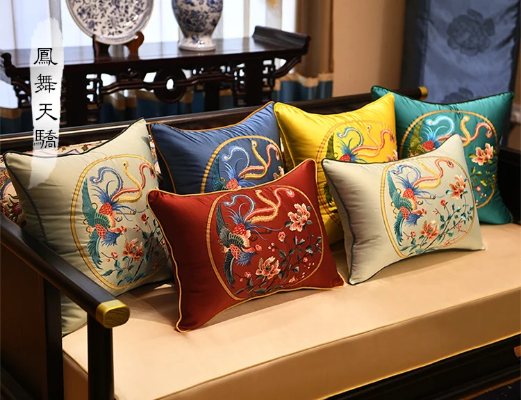 Classical Chinese Style Embroidery Phoenix Gold Yellow Cushion Cover Flower Bird Pattern Waist Pillowcase Decor for Sofa Bed