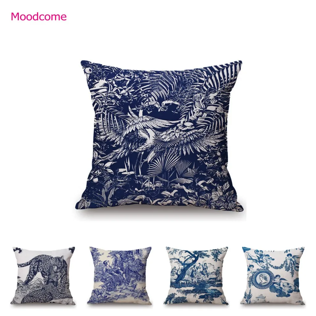 French Toile De Jouy Delft Blue Flamingo Bird Tiger Royal Court Pattern Elegant Decorative Sofa Pillow Case Cushion Cover Case  Read more