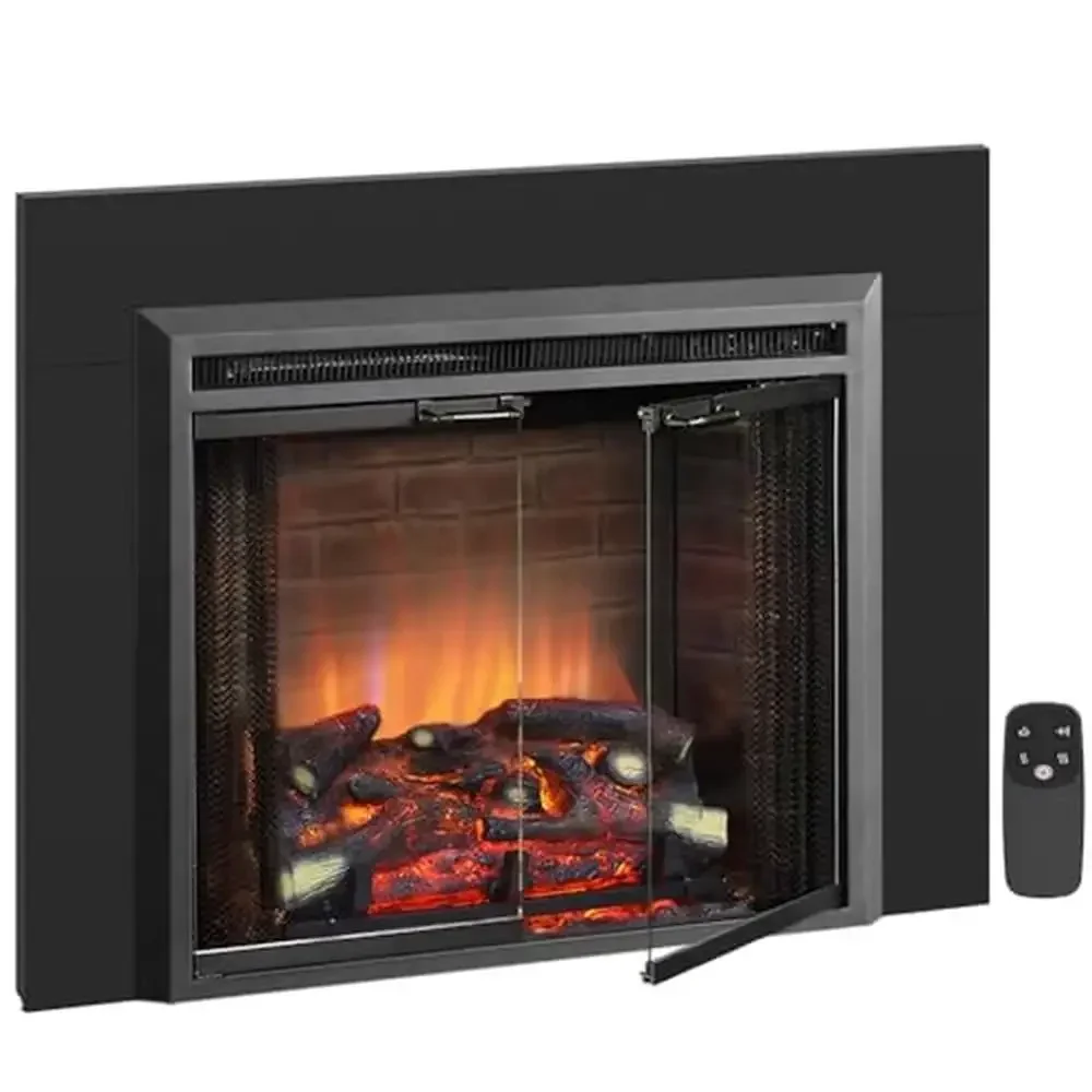 Klaus 33” Electric Fireplace Insert with Trim Kit, Fire Crackling Sound, Resin Log, Glass Door and Mesh Screen