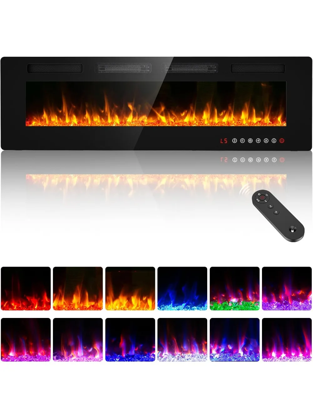 60" Ultra Thin Electric Fireplace Insert-ETL Certified, Recessed/Wall Mount, 3D Flame with Crystal, Remote & Touch