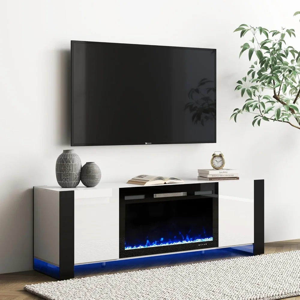 70" U-Shaped Leg TV Stand with 36" Electric Fireplace, High Gloss Finish Entertainment Center with Realistic LED Flame & Remote