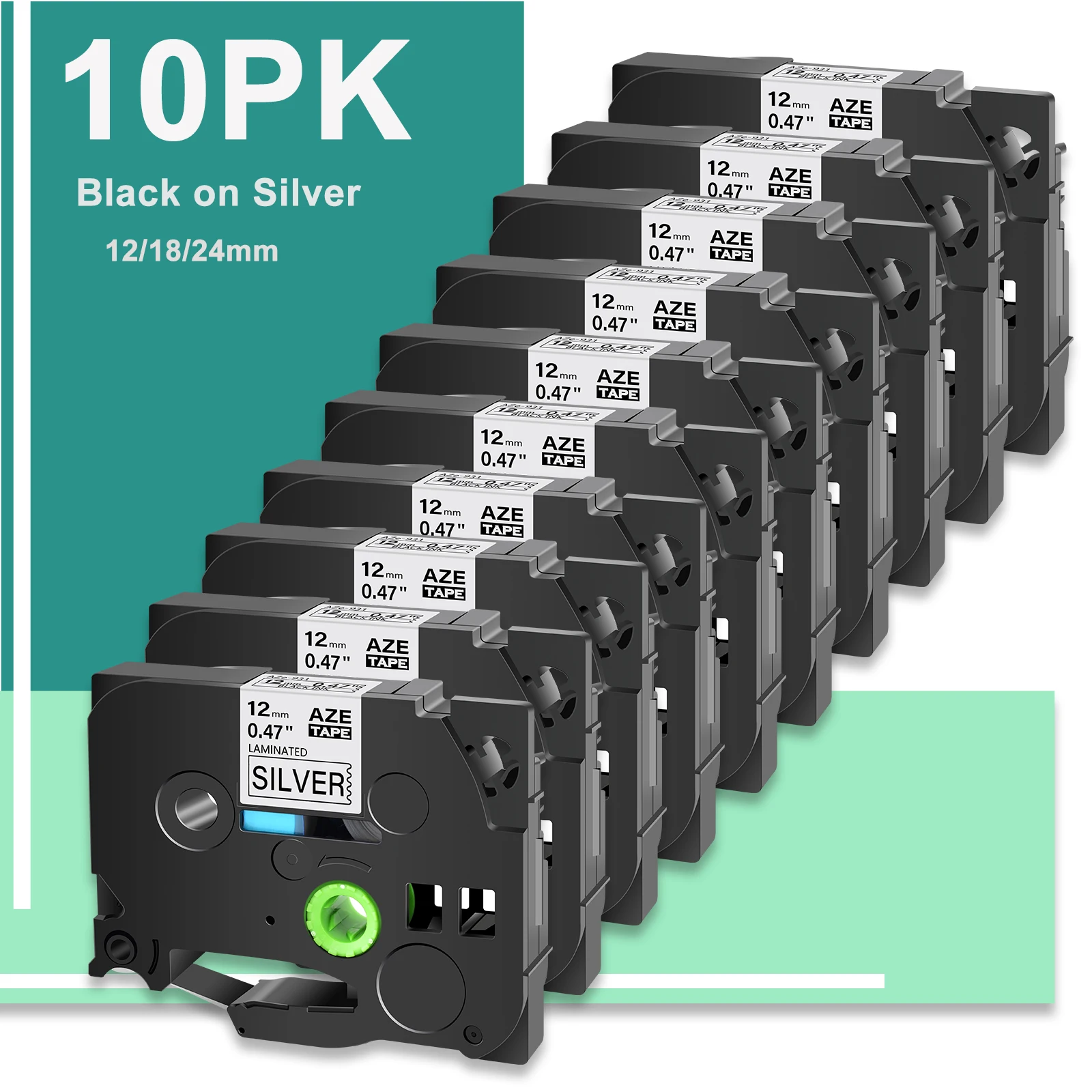 10PK Black on Silver Label Tape Compatible for Brother Tz TZe 931 12/18/24mm Laminated Ribbon Label for P-Touch PT-1010 Printers
