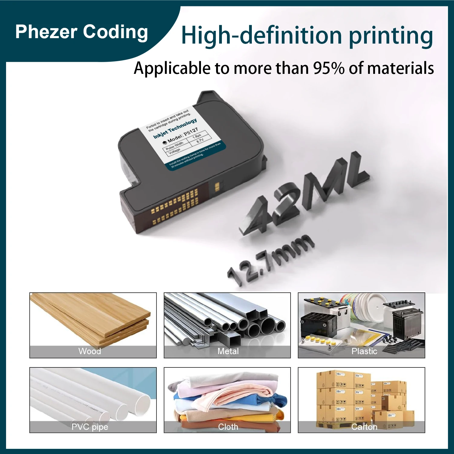 Phezer Printer Solvent Ink Cartridge 1/3/5/10Pcs PS127 12.7mm Quick Dry Black High Adhesion Handheld Online Inkjet Printer
