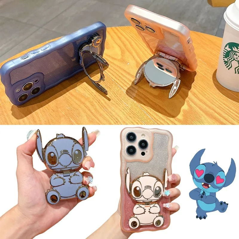 Disney Stitch Phone Stand Mirror Foldable Cartoon Finger Holder Cute Women Portable Phone Desktop Bracket Makeup Accessories