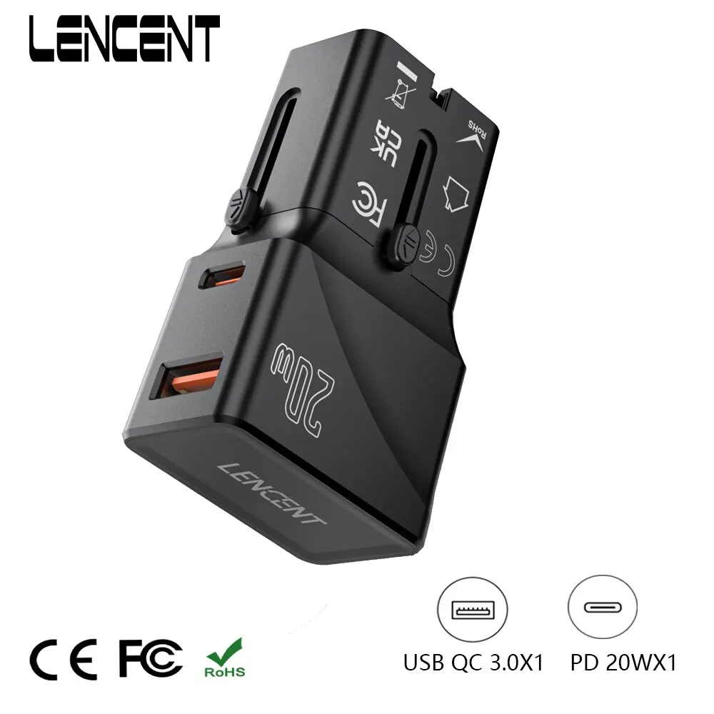 LENCENT Universal Travel Adapter With1 USB QC 3.0 Port and 1 PD 20W Type C Fast Charger Power Adapter for US EU UK AUS Travel