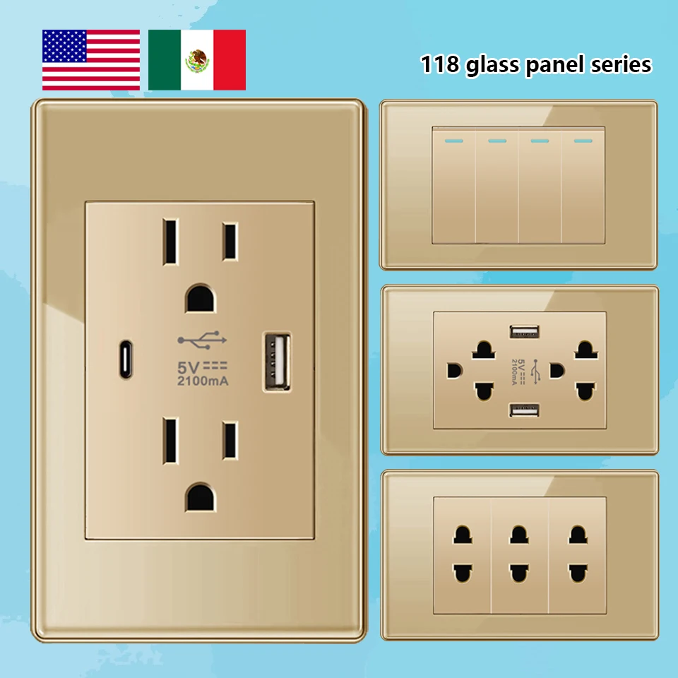 Depoguye US Mexico Wall Light Switch Socket 5V 2.1A USB Type-c Charger Plug, Golden Glass Panel American Standard Power Outlet