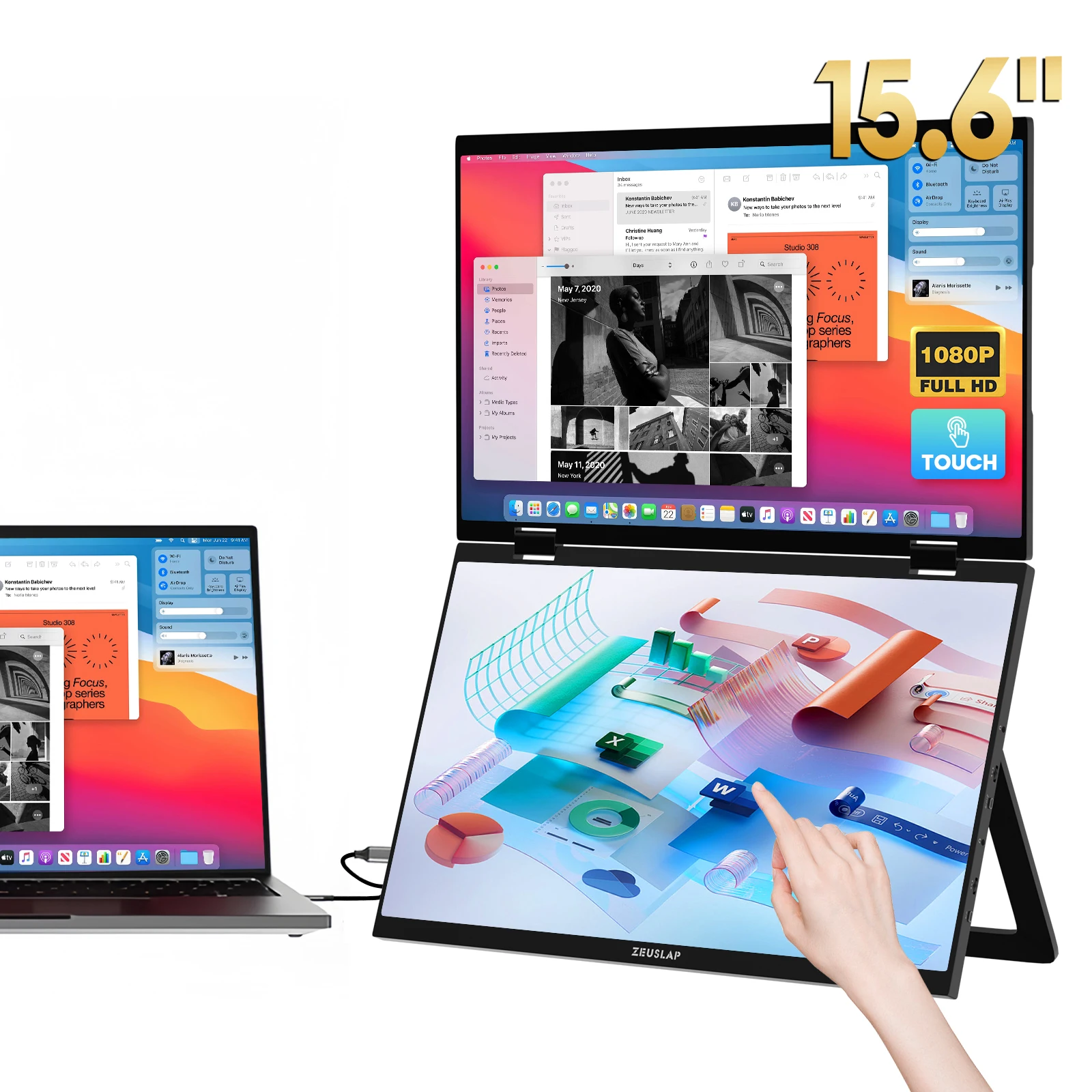 ZEUSLAP 15.6'' Dual Touch Stacked Foldable Portable Monitor Screen Extender for Windows & Mac OS with Driver Included