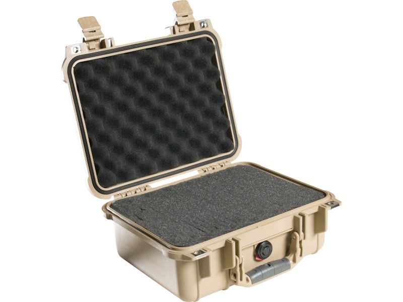 Pelican 1400 Small 13x11x6in Protector Waterproof Carry Case Desert Tan w/ Foam. Pelican 1400 Case is constructed of light weight structural resin with a polymer sponge o-ring seal and exclusive purge valve. Pelican supplies complete with pre-scored...  Read more
