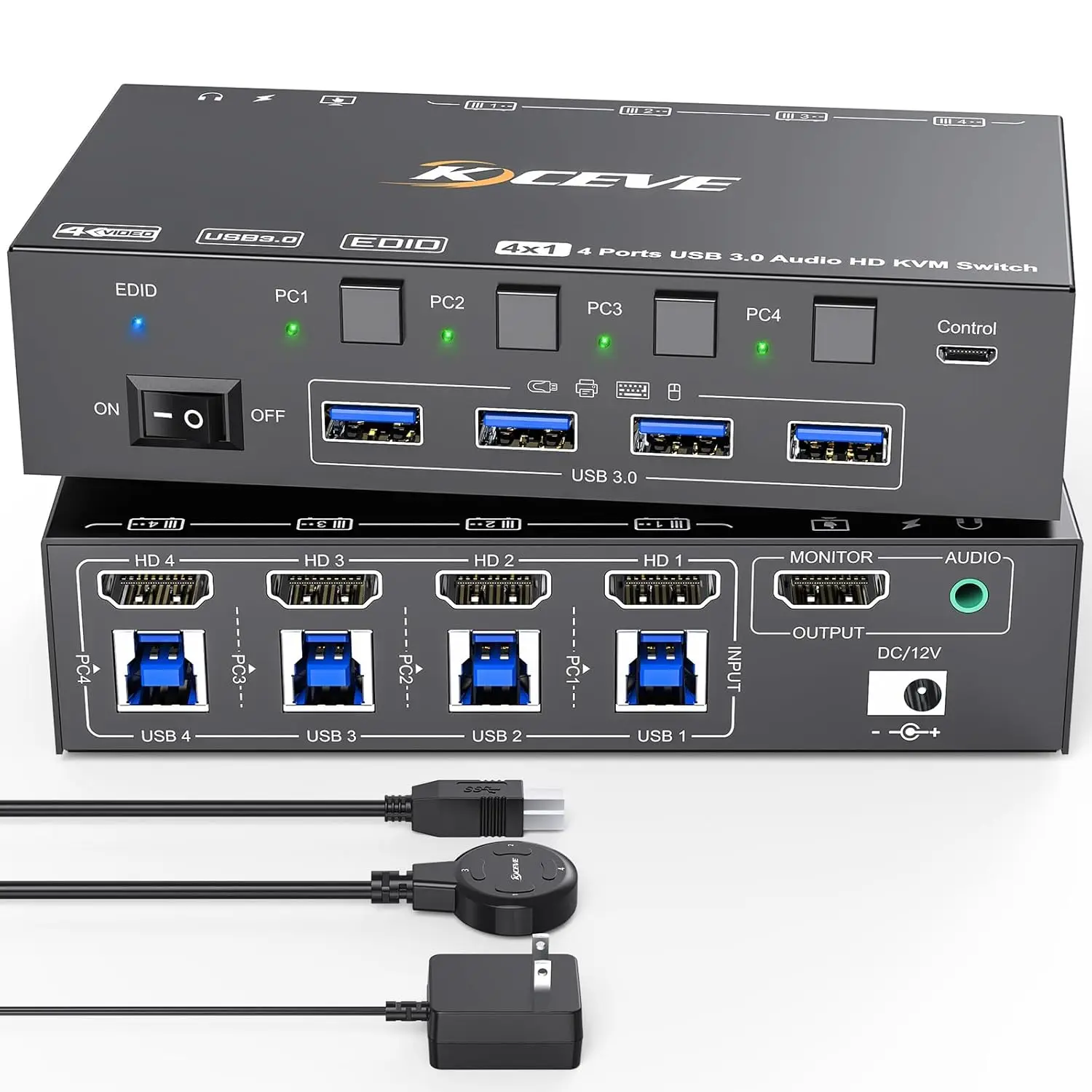 KVM Switch 1/2 Monitors 4 Computers HDMI, KCEVE 8K@60Hz 4K@144Hz USB3.0 KVM Switch Box with EDID Emulator for 4 PC 1/2 Monitors