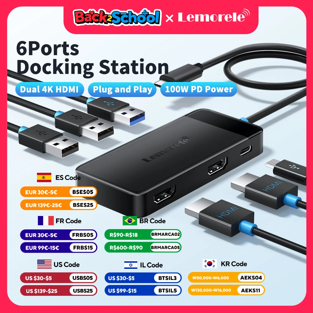 Lemorele TC122 USB C HUB Dual HDMI 4K Docking Station USB 3.0 PD 100W Type C Port for Macbook iPad M2 M1 Steam Deck