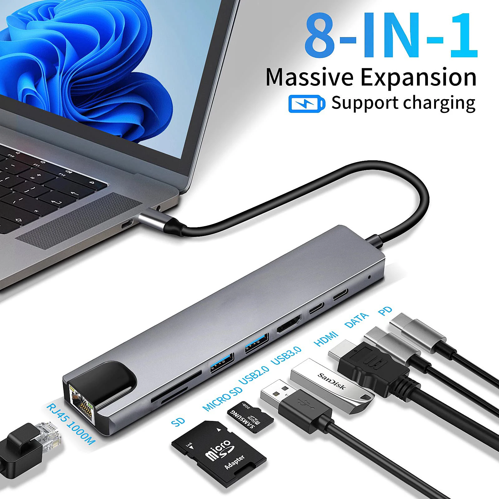 8 in 1 USB C Hub Type C to 4K HDTV Adapter with RJ45 SD/TF Card Reader Fast Charger for MacBook Notebook Windows Laptop Computer
