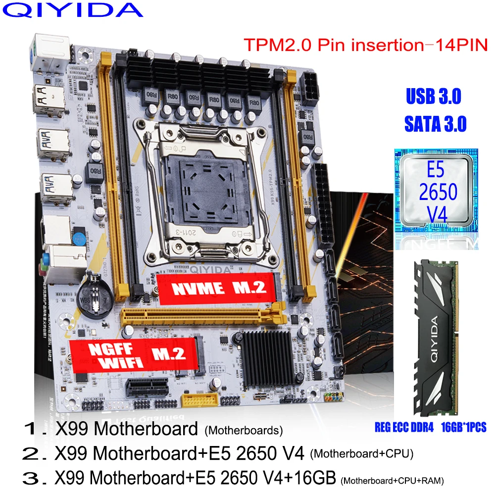 QIYIDA X99 Motherboard Set LGA 2011-3 Kit Xeon E5 2650 V4 CPU Processor With 16GB DDR4 ECC RAM Memory SATA3.0 USB 3.0 NVME M.2