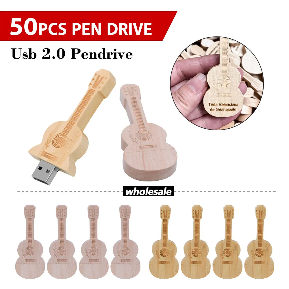 50PCS/LOT Wood Guitar USB Flash Drive 128GB Free Custom Logo Pen Drive 64GB Wooden GOOD Memory Stick Creative Gifts U Disk 32GB